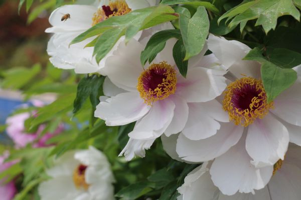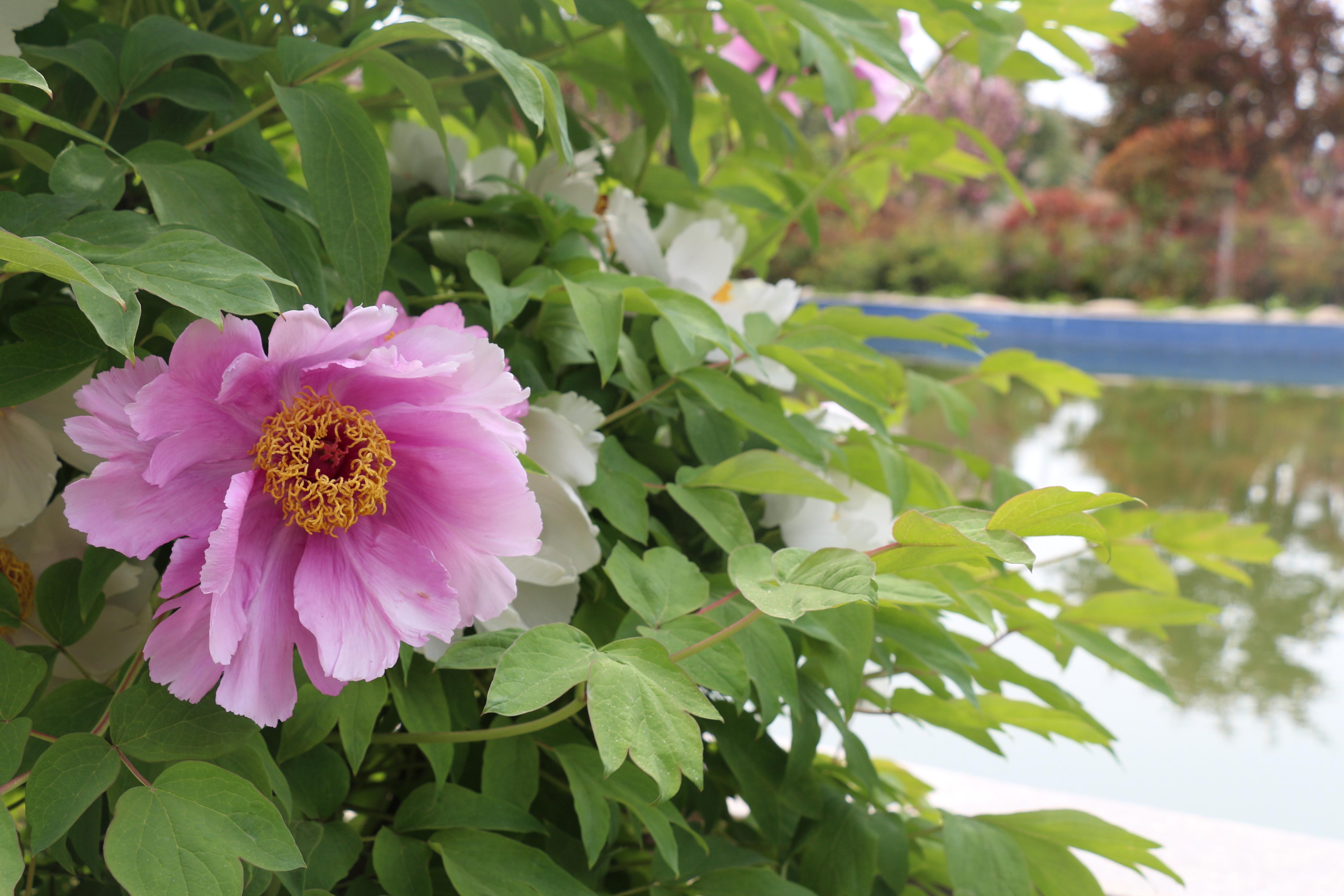 牡丹三兩朵,映入池塘間;