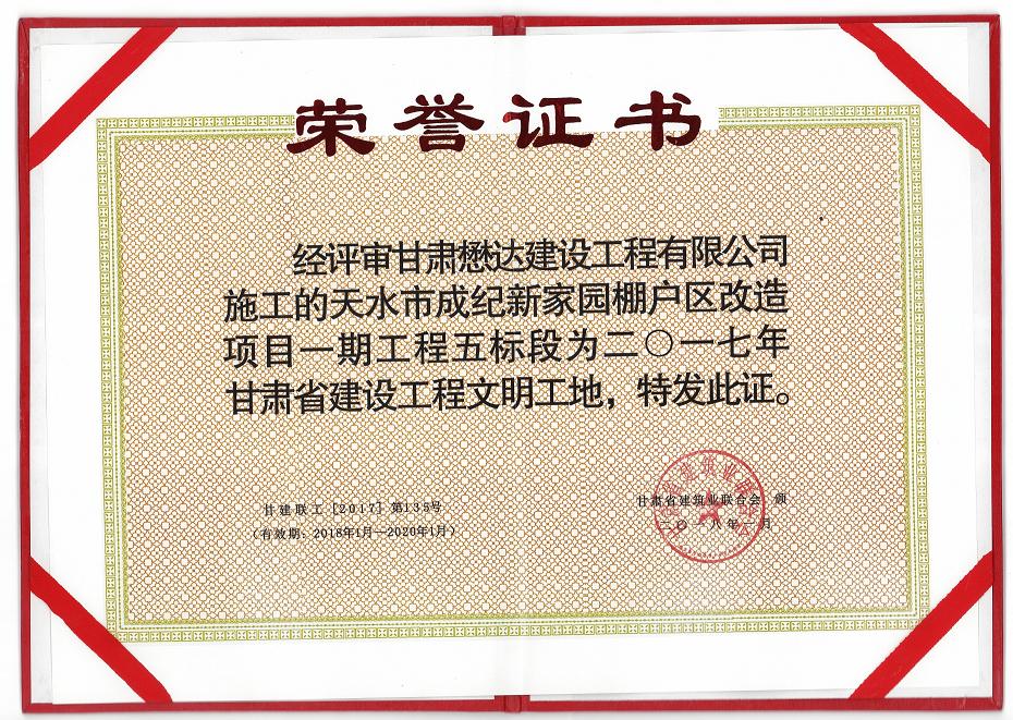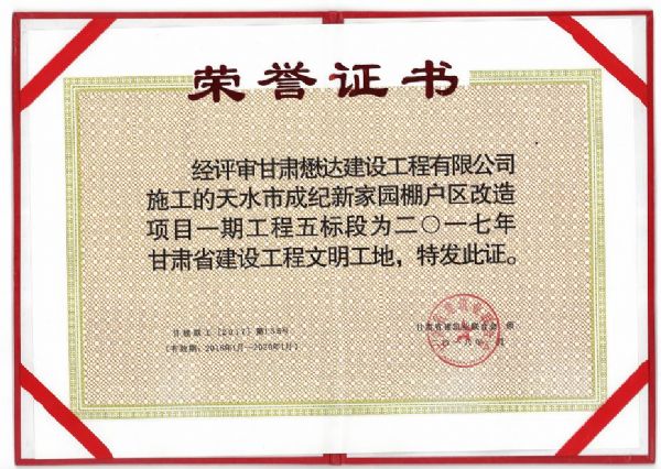 日前,由甘肅懋達(dá)建設(shè)工程有限公司承建的徽縣宜和家苑住宅小區(qū)項(xiàng)目、天水市成紀(jì)新家園棚戶區(qū)改造項(xiàng)目一期工程五標(biāo)段項(xiàng)目在2017年全省建筑業(yè)“三優(yōu)一文明”評(píng)選中喜獲“2017年甘肅省建設(shè)工程文明工地”榮譽(yù)稱號(hào)。