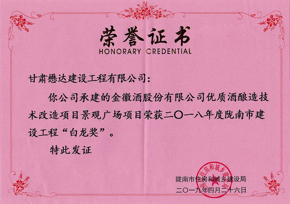 公司承建的金徽酒股份有限公司優(yōu)質(zhì)酒釀造技術(shù)改造項(xiàng)目景觀廣場(chǎng)項(xiàng)目榮獲2018年度隴南市..