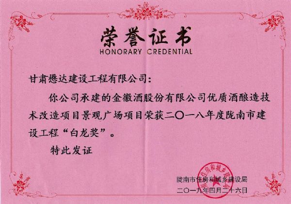 近日,在隴南市2019年建設(shè)工程質(zhì)量安全監(jiān)管工作視頻會(huì)議上,公司承建的金徽酒股份有限公司優(yōu)質(zhì)酒釀造技術(shù)改造項(xiàng)目景觀廣場(chǎng)項(xiàng)目榮獲2018年度隴南市建設(shè)工程“白龍獎(jiǎng)”。