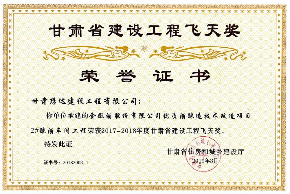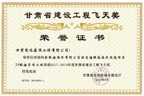 甘肅省建設工程飛天獎是對全省建設工程質(zhì)量最高水平的表彰,該獎項的獲得是對2#釀酒車間工程項目工程質(zhì)量管理工作的充分肯定和對工程質(zhì)量的高度認可。