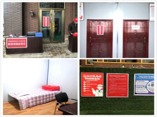 工地現(xiàn)場疫情檢測點(diǎn)、隔離觀察室及宣傳海報(bào)。