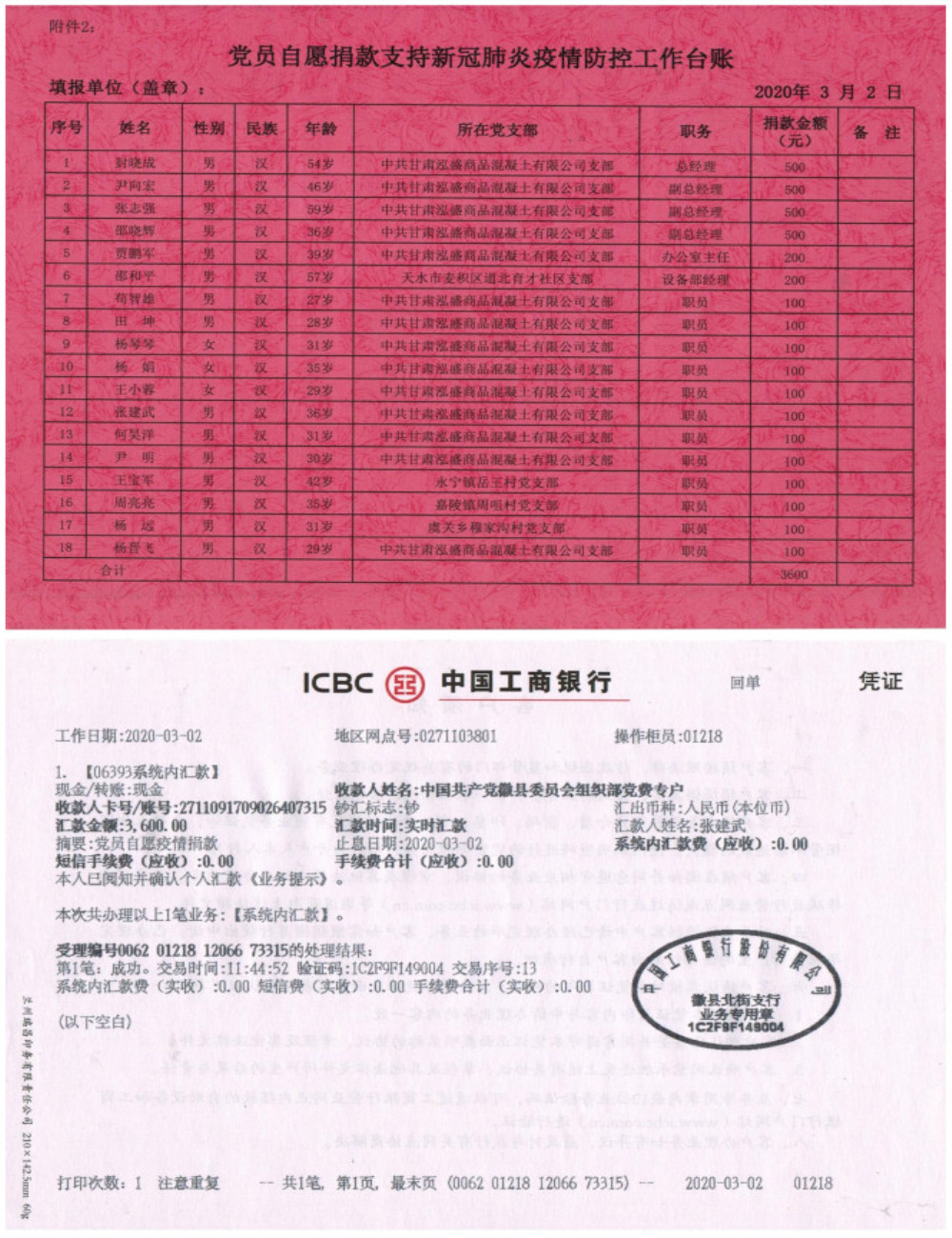 為積極響應(yīng)黨中央對(duì)廣大黨員的號(hào)召,表達(dá)對(duì)新冠肺炎疫情防控工作的支持,3月2日,甘肅泓盛商品混凝土有限公司黨支部組織開展抗擊疫情自愿捐款活動(dòng)。全體黨員支持疫情防控斗爭(zhēng)愿望強(qiáng)烈,紛紛踴躍捐款。支部18名黨員(含預(yù)備黨員)共計(jì)捐款3600元,已按組織程序上繳中國(guó)共產(chǎn)黨徽縣委員會(huì)組織部黨費(fèi)專戶。
