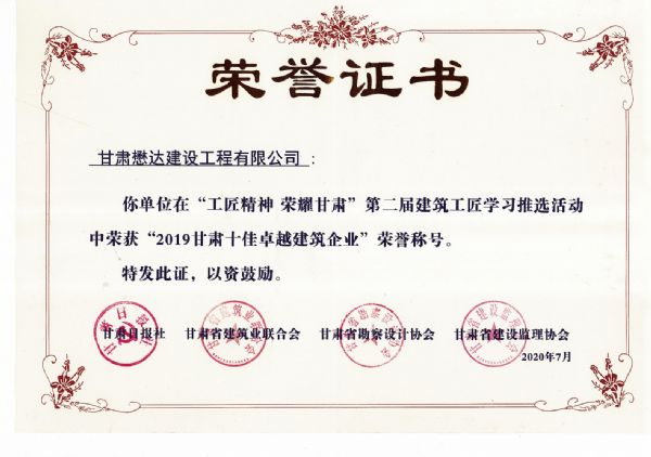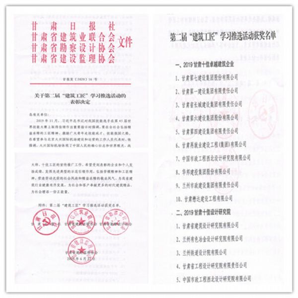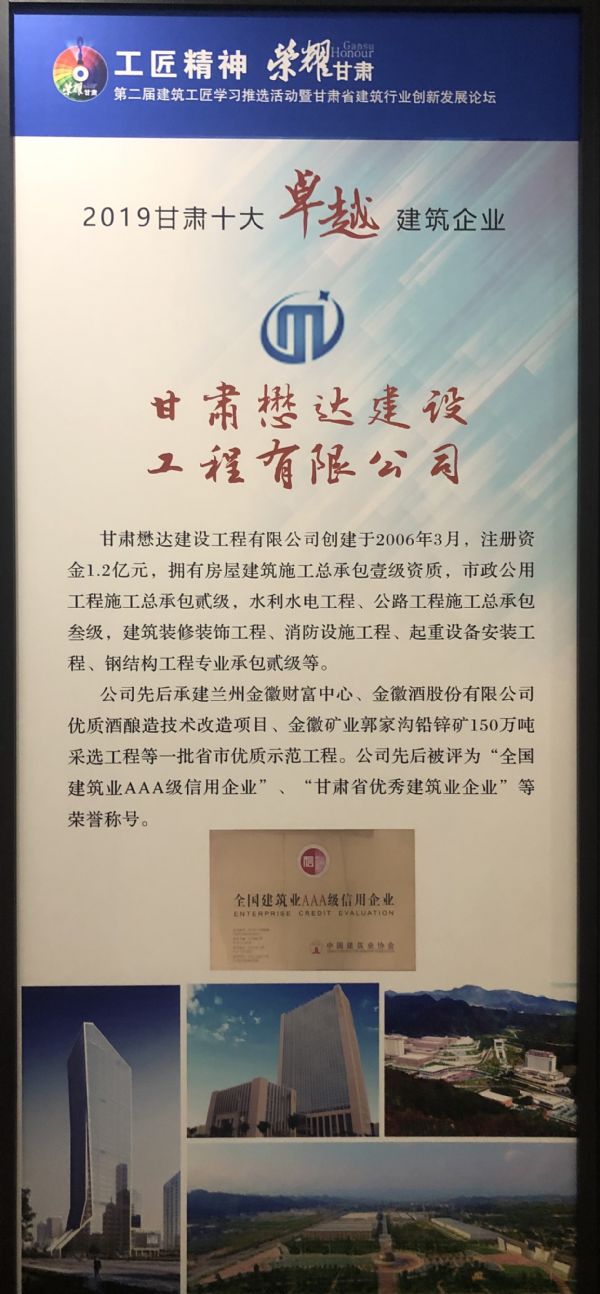 7月3日,“工匠精神,榮耀甘肅”第二屆建筑工匠學(xué)習(xí)推選活動暨甘肅省建筑行業(yè)創(chuàng)新發(fā)展論壇在蘭州市舉辦。會議揭曉了第二屆建筑工匠學(xué)習(xí)推廣活動評選結(jié)果,甘肅懋達(dá)建設(shè)工程有限公司獲得“2019甘肅十佳卓越建筑企業(yè)”榮譽(yù)稱號。