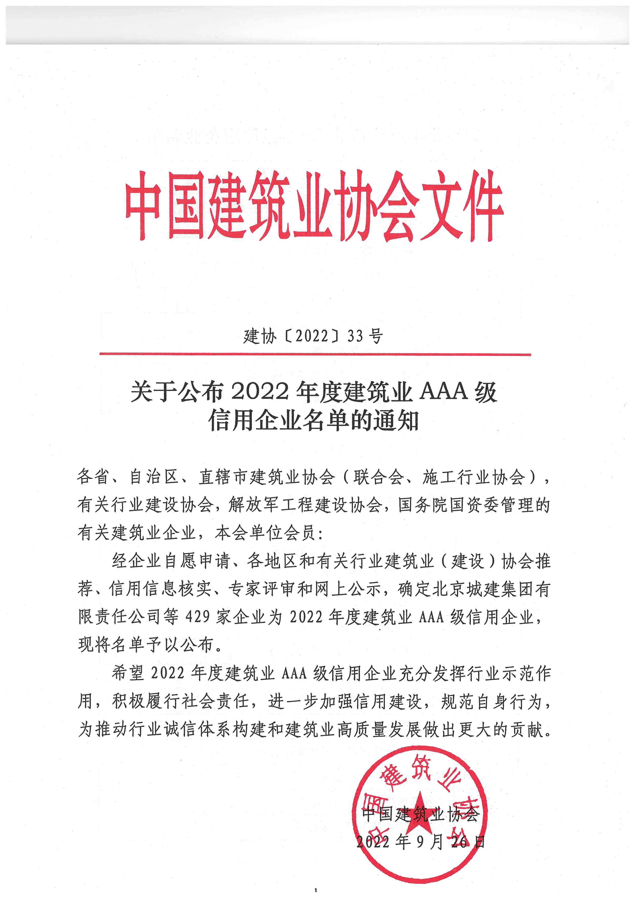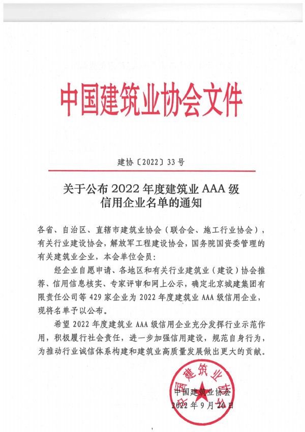 近日,從中國建筑業(yè)協(xié)會(huì)傳來捷報(bào),公司獲評(píng)2022年度“建筑業(yè)AAA級(jí)信用企業(yè)”。