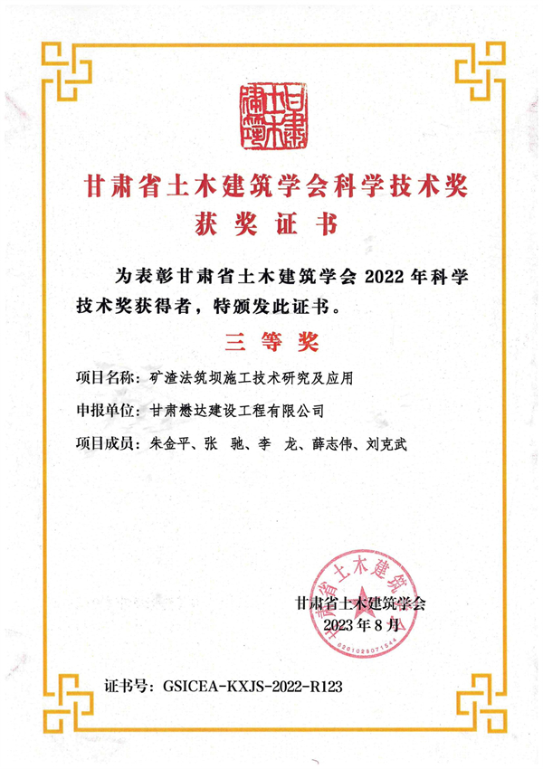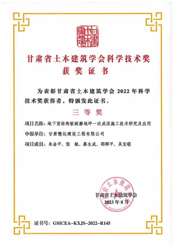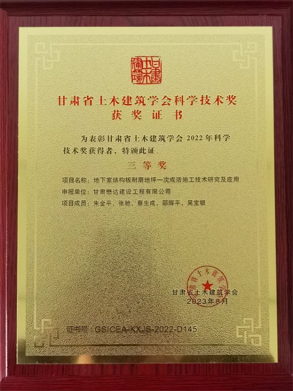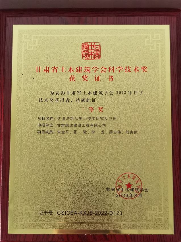 近日,甘肅省建設(shè)行業(yè)科技創(chuàng)新成果研討會(huì)暨頒獎(jiǎng)典禮在蘭州隆重舉行。甘肅懋達(dá)建設(shè)工程有限公司申報(bào)的“地下室結(jié)構(gòu)板耐磨地坪一次成活施工技術(shù)研究及應(yīng)用”和“礦渣法筑壩施工技術(shù)研究及應(yīng)用”分別榮獲2022年度甘肅省土木建筑學(xué)會(huì)科學(xué)技術(shù)三等獎(jiǎng),8名項(xiàng)目成員獲得大會(huì)表彰獎(jiǎng)勵(lì)。