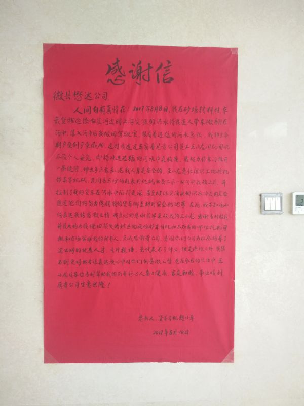 趙小平說:“8月8日中午,我駕駛貨車途徑柳林白崖河,由于突降暴雨、河水猛漲,洪水將我連人帶車掀翻至河中,我被困在駕駛室,當時生命和財產受到了嚴重威脅。這時,貴公司王小龍立即向我伸出援手,在第一時間組織工地挖機、鏟車等機械,連同岳克斌、岳涵、陳興銀等員工一起,順利將我救上岸,并及時控制了我的貨車沒有陷的更深。在此我表示深深地謝意,感謝貴公司為社會培養(yǎng)這么好的優(yōu)秀人才,愿幫助我的幾位好心人身體健康、家庭和睦、事業(yè)順利,愿貴公司生意興隆!