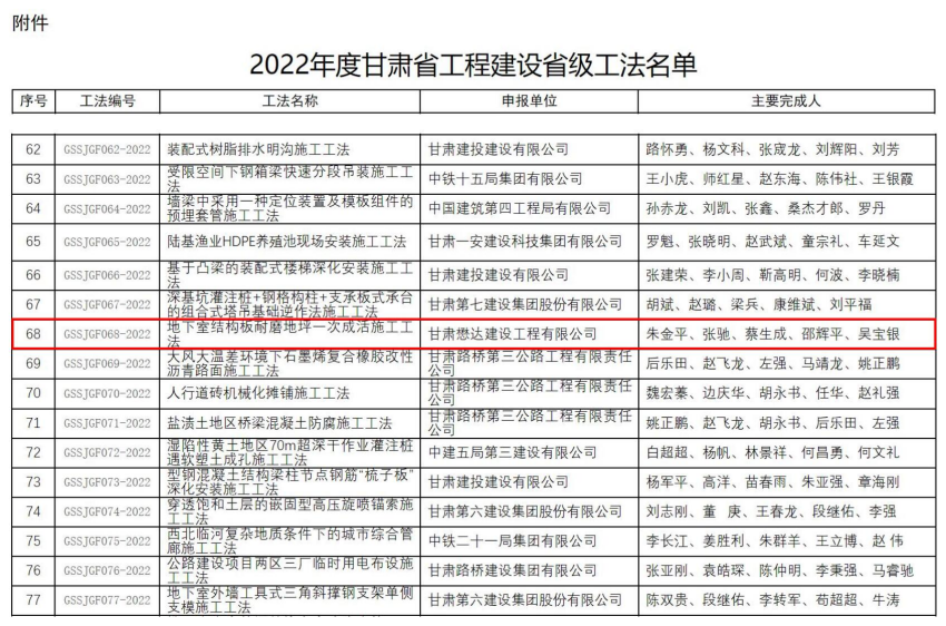 6月20日,甘肅省住房和城鄉(xiāng)建設廳下發(fā)文件《甘肅省住房和城鄉(xiāng)建設廳關于公布2022年度甘肅省工程建設省級工法的通知》(甘建質(zhì)〔2023〕127號),公司《地下室結(jié)構(gòu)板耐磨地坪一次成活施工工法》,根據(jù)《甘肅省工程建設工法管理辦法》(甘建工〔2016〕152號),省住建廳評審,經(jīng)公示無異議,獲評2022年度甘肅省省級工法。